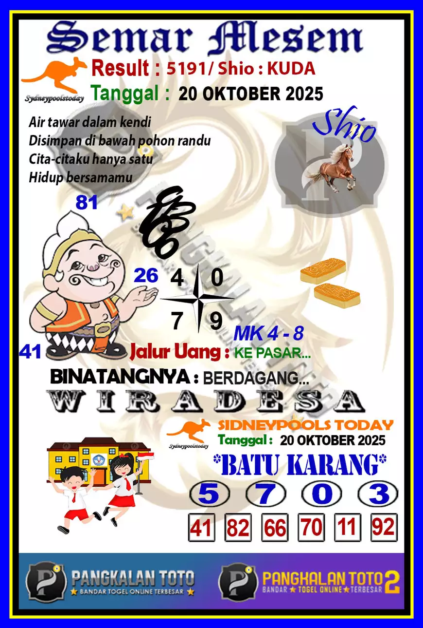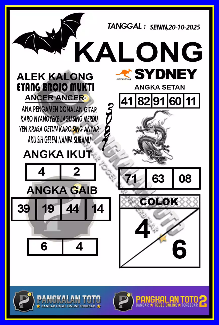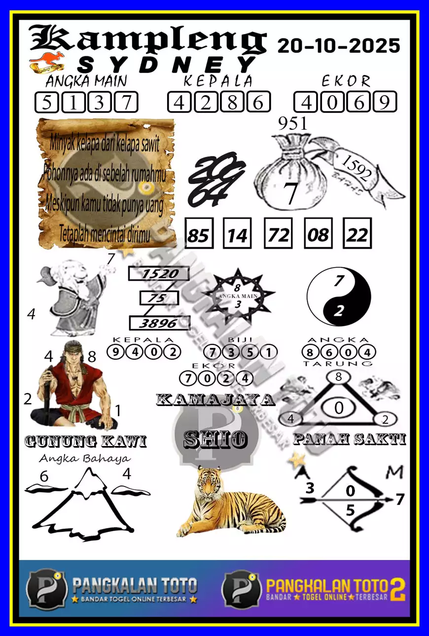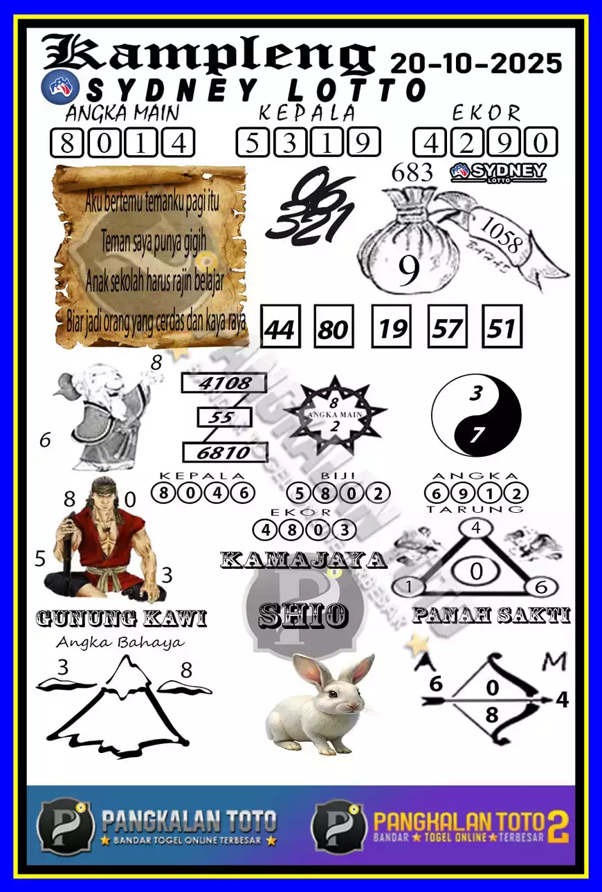Jelasnya syair sydney Sendiri adalah kumpulan gambar, sajak, atau angka yang memiliki arti tersendiri. Yang bisa kamu tafsirkan menjadi angka prediksi yang bisa kamu pasang di situs – situs toto togel terpercaya. Forum Syair SDY VIP sendiri merupakan salah satu pasaran toto terbesar dengan peminat terbanyak saat ini.